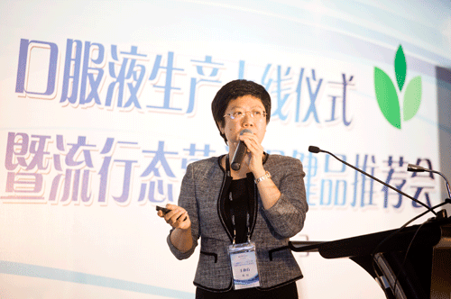 同时,仙乐制药精心研发的新品胶原蛋白口服液也浮出水面,这种水蜜桃味的鱼胶原蛋白口服液,不单每瓶含小分子量多肽鱼胶原蛋白,而且还含有来自针叶樱桃的天然维生素C,在保证美味可口的同时,还让女性消费者以快乐开心的心情获取了她想要的营养物质。其实,更为重要的是,这种口服液采用了经过EDI与反渗透技术处理的“超纯水”,非常的纯净,从而有效地保障了产品的稳定性。再加上是在10万级的纯净空间、采取UHT瞬间高温杀菌技术,并配合GMP的管理标准进行生产,因此产品根本不需要添加防腐剂就可保质两年,且口味纯正、功能因子活性十足。 本次会议上,仙乐制药还提出了一个全新的概念——“流行态营养保健品”,此类产品强调在满足消费者摄取各种营养素、功能因子需求的同时,要注意“色、香、味”,让消费者能够“方便、快捷、安全、快乐”地食用营养保健品,而不是以一种吃药的心态来进行消费。仙乐制药自2008年开始,就开始进行此类产品的研发与生产。 流行态营养保健品可以随时随地服用(有些产品甚至不要水),服用量也没有太大的限制,产品具有流行趋势,开发周期较短,以市场为主导,是年轻人群、特别是中青年女性的最佳选择。除胶原蛋白口服液外,牛磺酸维生素饮品、多维营养软糖、DHA营养软糖、果蔬纤维粉、益生菌粉、蛋白粉都可以是典型的流行态营养保健品。 仙乐制药在产品推荐会上,还创新性地向客户推荐了一些新鲜的饮用方法。如“益清两白”,就是将益生菌粉与胶原蛋白粉溶入荔枝汁内进行饮用,让女性消费者能内外兼修,满足美容需要的同时,还非常的清爽可口;如“苹添春色”,则是将果蔬纤维粉溶入苹果汁中,同样有可口又营养的效果。  运营副总经理陈琼演讲