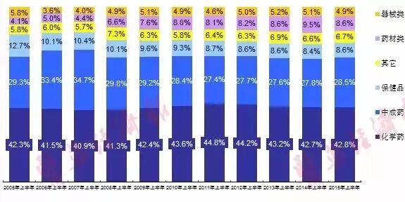 2015年上半年药品零售市场化学药、中成药和保健品的销售额占比分别为42.8%、28.5%和8.6%。其中,保健品上升0.2个百分点。 药品零售市场各大类销售额占比变化