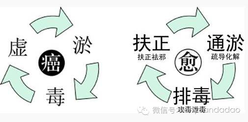 在中医治癌方面,中医具有整体调整和辨征施治的特色和优势。尤其在对中晚期癌症,例如对晚期肝癌、胰腺癌、胃癌的患者,其治疗和调理优势相当显著,中国中医研究院广安门医院余桂清等创制的扶正冲剂(即健脾益肾中药冲剂),用于晚期胃癌术后化疗病人,调理提高了患者的免疫功能,减轻了化疗对消化和骨骼造血系统的不良反应,延长了患者的生存期,其治疗晚期胃癌术后患者103例,3年生存率77.31%,5年生存率53.7%,10年生存率47.3%。 而当今现代医疗治癌方法主要是手术和放化疗,但事实上90%的患者经上述治疗后均有程度不等的骨骼造血系统、消化系统等的毒性反应,毛发脱落,局部组织损伤,心肝肾肺损伤,神经损伤,免疫抑制,致癌作用,有些抗癌药物可以引起细胞基因发生突变,从而产生其他类型的癌症,机体处于严重失衡状态,甚而加速死亡,现代医学研究比较热闹的基因疗法,至今尚无大宗晚期实体瘤患者获效的确切报道。