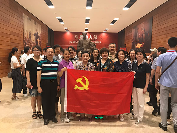 进入主展厅,首先映入眼帘的是马克思、恩格斯雕塑群像和反映马克思生前家庭生活《革命一家人》和革命同伴恩格斯《伟大友谊》的巨幅油画,栩栩如生的雕塑和画像,向人们生动展示了一代伟人高大形象,仿佛把我们带入了百年前的峥嵘岁月。协会全体员工手执党旗在雕像前合影留念。 大家先后参观了“伟大革命导师马克思的壮丽人生、马克思主义中国化的光辉历程、马克思主义题材的美术作品三大部分展览。从100多件珍贵手稿、900余种原版图书、150多幅美术作品、6组雕像群中感受和领略马克思的生平、革命实践、理论贡献和崇高的精神境界,尤其了解马克思主义在中国的传播运用和丰富发展的光辉历程。